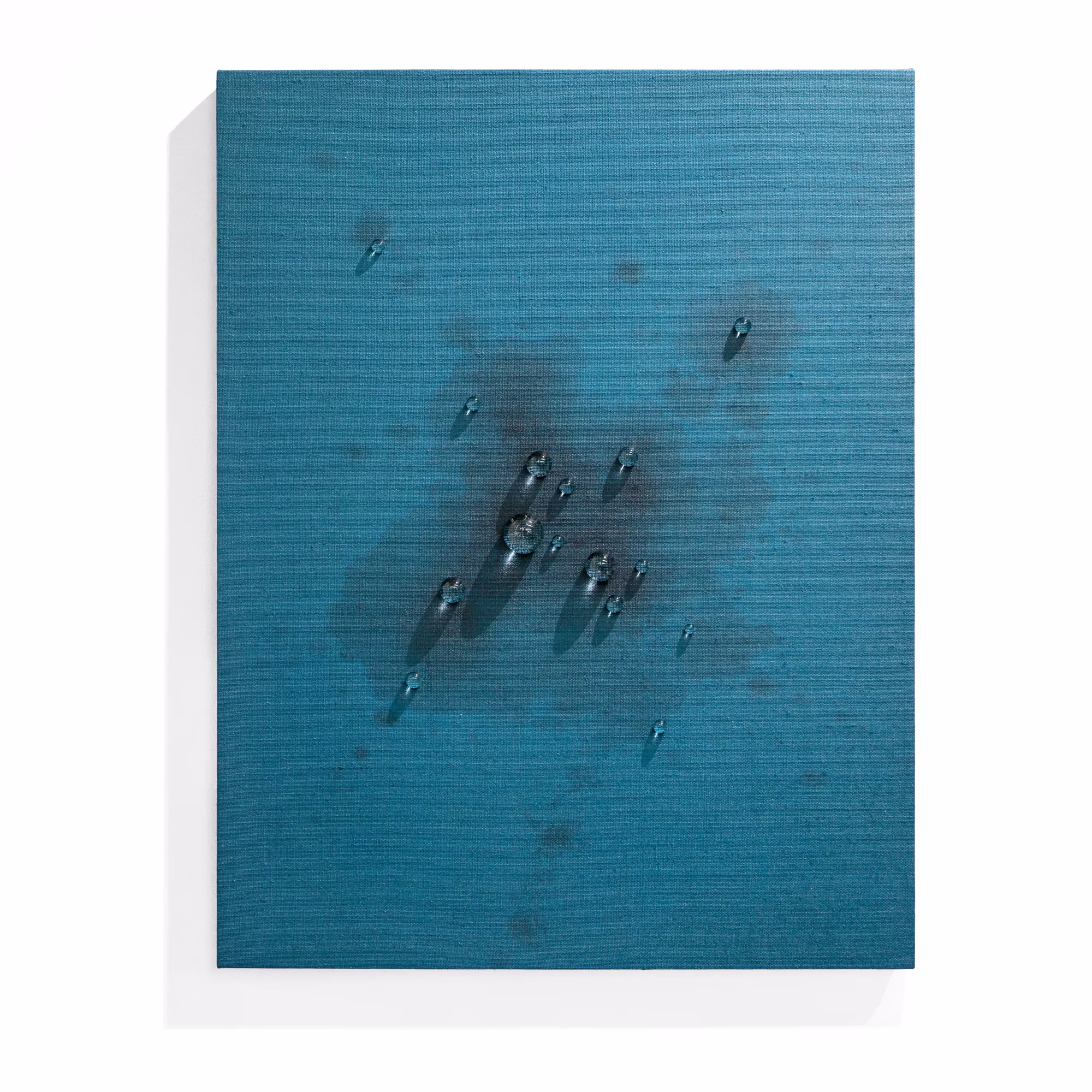 Yoo’s recent work focuses on the form of glass water droplets, arranged delicately across yellow-stained wood panels. These droplets, shaped with care and intention, seem to shift depending on the light or the viewer’s position, casting shadows that move and evolve throughout the day. Drawing from the traditional Korean color system of obangsaek and the decorative painting style of dancheong, Yoo offers his own interpretation: one that blends emotion, memory, and a quiet sense of time passing. Each droplet feels personal, almost like a fragment of his lived experience. Together, they form a landscape that’s both intimate and open, an invitation to pause, to reflect, and to notice what often goes unseen.